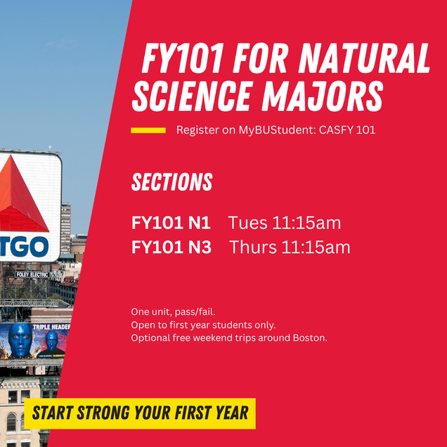Your fourth course should be a writing course: CAS PY 195: Freshman Seminar for Physicists (offered fall only, 1 unit) – Optional Seminar where freshman physics majors learn successful strategies for studying physics and become familiar with BU’s policies, procedures, resources, and extracurricular activities. Exploration of research and career opportunities through invited speakers, book discussions, and laboratory tours. -OR- First-Year Seminar: FY 101 (1 unit) – Optional FY101 is a one-unit, low stress, non-academic class that serves as a semester-long introduction to BU and college life. FY101 helps you get a head start on making connections at BU. Each section is taught by a student peer mentor and a staff instructor. -OR- First-Year Career Development Seminar: FY 102 (offered spring only, 1 unit) – Optional FY102 will help first-year students get started on utilizing the Career Development Cycle to maximize their time at BU. During this course, students will create a plan of action towards choosing a major, creating a resume, finding an internship, and preparing for a career they will love. Seminars are offered in various fields of interest and include guest speakers from different industries. If you are interested in the Core Curriculum, we recommend registering for CAS CC 101 for your writing course (see above in Course #4). There are additional natural science Core courses offered; however, we do not typically recommend these for natural science majors who are already taking a lab course this semester. If you have questions about completing additional Core courses beyond CAS CC 101, please talk about this with your academic advisor! Find out more about the Core Curriculum, the Hub, and registration here. Ready to register? Let’s go – click here! For more information about your specific major requirements click here!Course #4: Writing Course