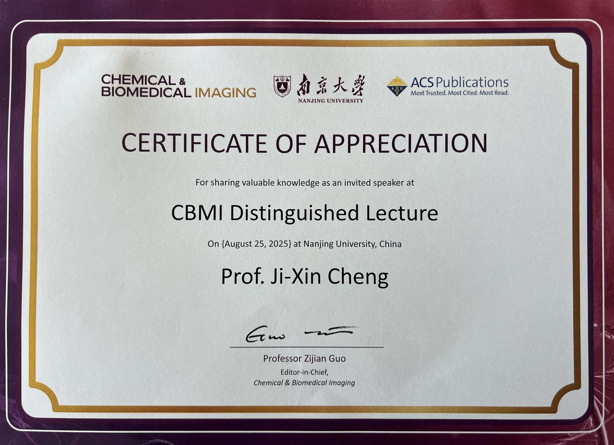 On August 25, 2025, Professor Ji-Xin Cheng delivered the inaugural CBMI (Chemical and Biomedical Imaging) Distinguished Lecture at Nanjing University. His lecture marked the beginning of this prestigious series, highlighting cutting-edge advances in imaging science and inspiring future collaboration in the field.