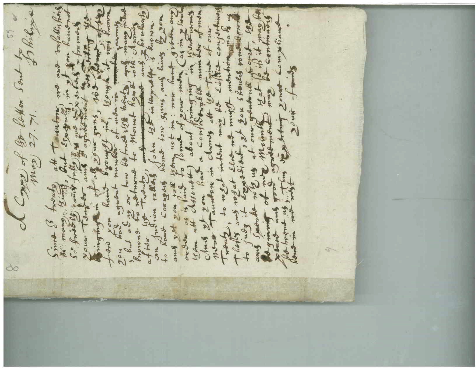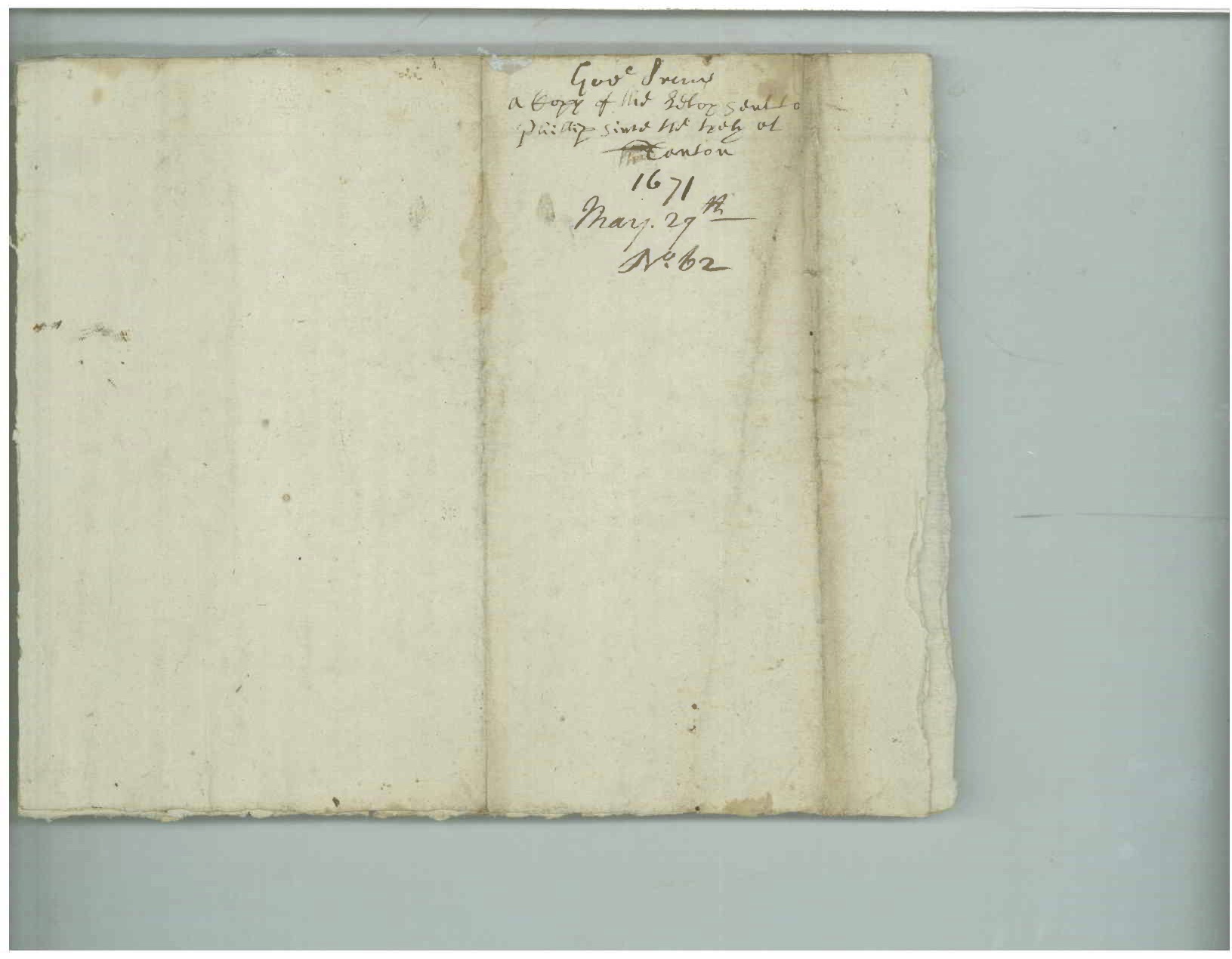 Description: A letter from Plymouth Colony’s Governor Thomas Prence, addressed to Philip, dated May 27, 1671. Prence claims Philip violated a treaty, signed in Taunton, that bound Philip to hand over all guns in the Wampanoags’ possession and demands that Philip speak before the General Court regarding this violation.