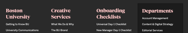 Although this can change due to specific project guidelines, generally for new websites, copy edit does a free read of top-level pages for a website (the home page and the other landing pages). For example, in the screenshot below, the top-level pages would be the home page, Boston University, Creative Services, Onboarding Checklists, and Departments.
