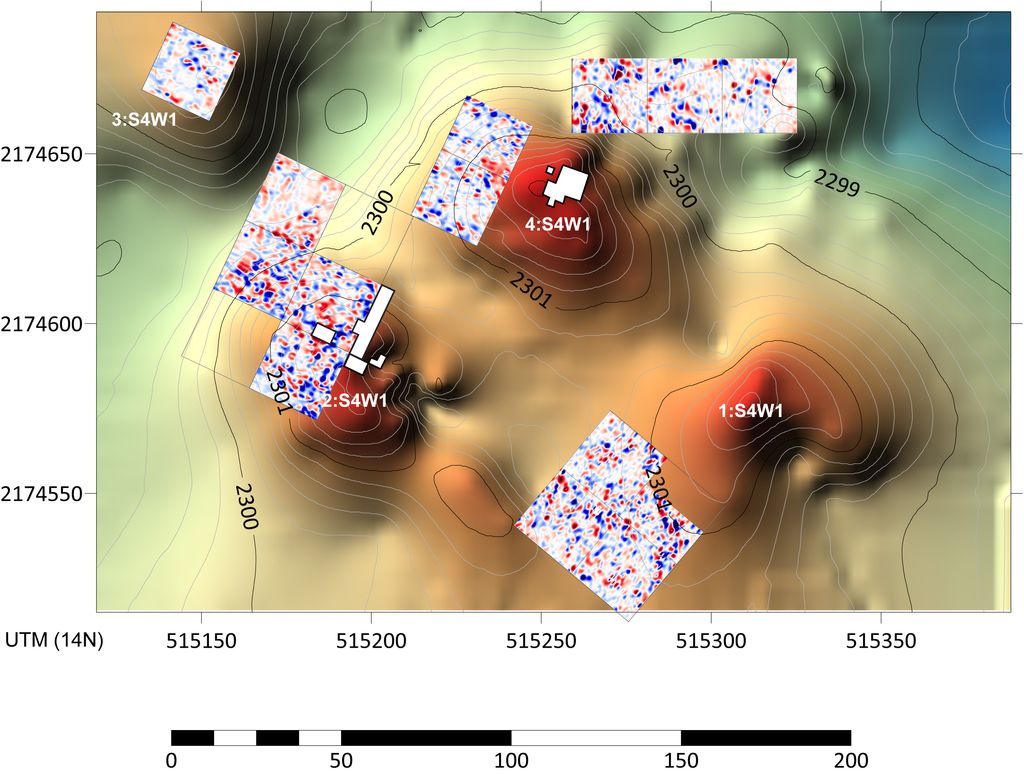 Platform complexes of southern neighborhood center with overlying magnetometry mapping and excavations in white.