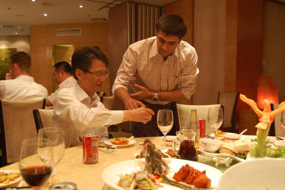 | Gaurav Tanna pours baijiu for Mr. Harry Sung, president of the AC division of LG China as a ritual of respect |