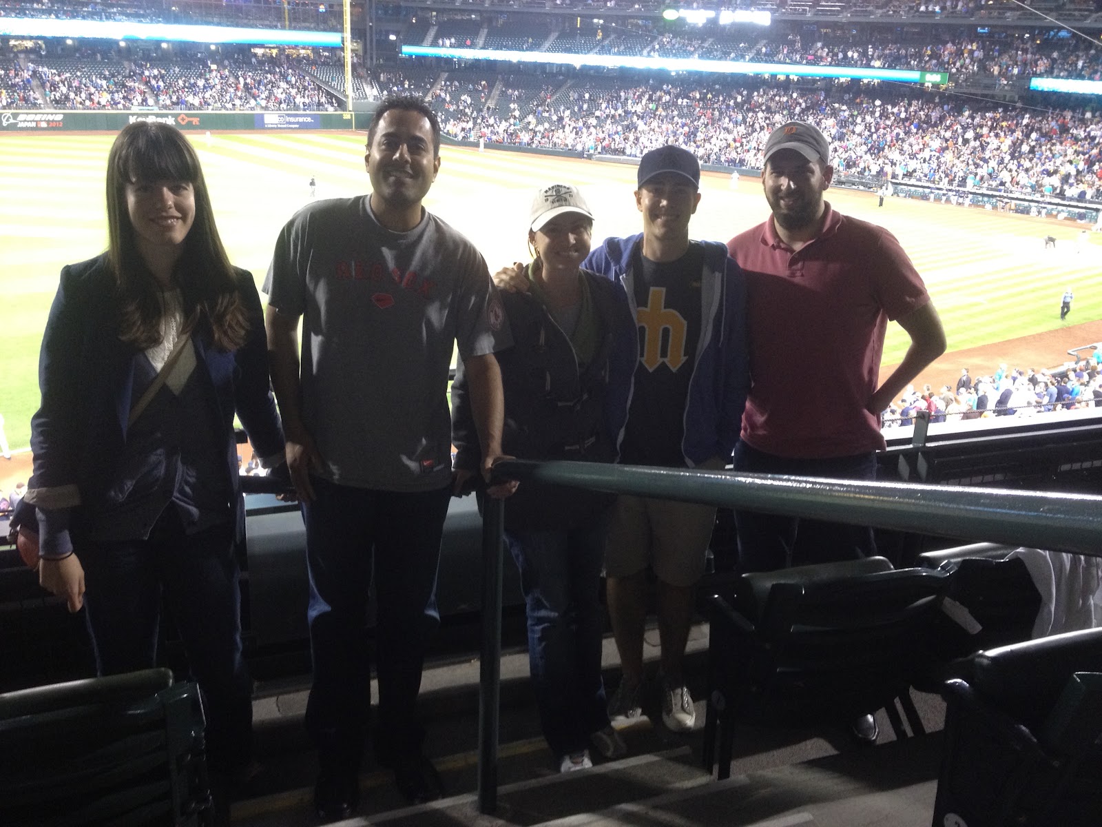 | Olivia Horsfield (GSM, '13), Parag Vaish (GSM, '03), Amy Fox (EDM, '12), Parker Fox (GSM, '12), and Ryan Sosin (GSM, '13) represent BU at a Red Sox-Mariners game at Safeco Field |