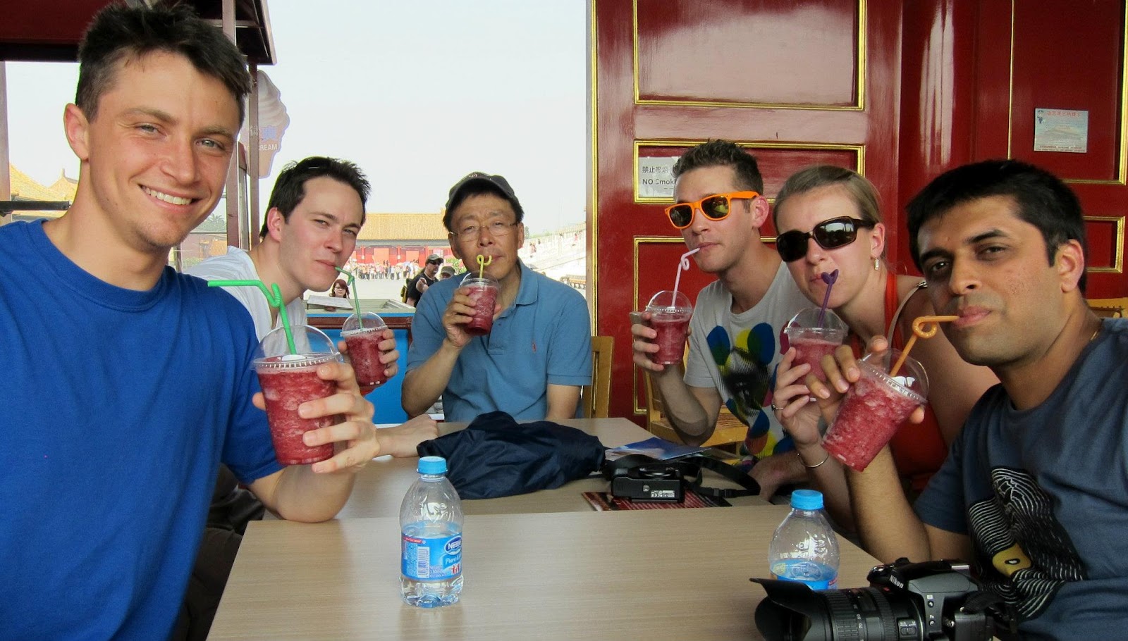 | (L to R) Evan DiLeo, Jonathan Caldwell, Ken Hoge, Caroline Keely, and Gaurav Tanna take smoothie break with Professor Kim in the Forbidden City in Beijing |