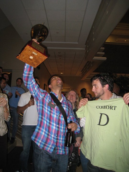 Last year…it was a battle to the end with Cohort C and Cohort D taking every other competition and C finally squeezing out enough points to take the lead and win the cup. Needless to say, Cohort D was slightly bitter and with motivated first and second years, D remained in the lead the much of the year. It was a competition that brought us together as classmates. It was a nice distraction and much needed break from the rigors of a full time MBA.