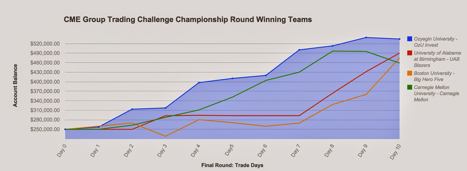 Three teams from SMG's own Mathematical Finance, MS program participated in CME Group's Trading Challenge placing 3rd, 5th and 43rd in a field of over 350 teams. Student-led teams used live data in a simulated environment with guidance from faculty advisers. To learn more about this annual competition, visit the CME Group's 2015 Trading Challenge webpage.