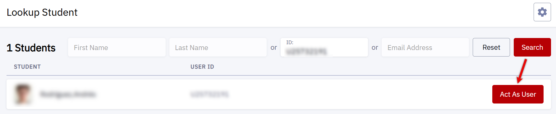 - Search for the applicable student, and then select Act As User.