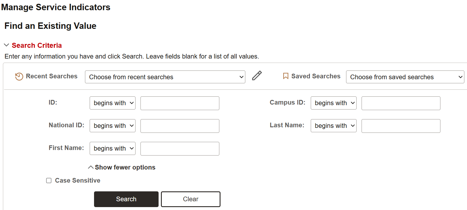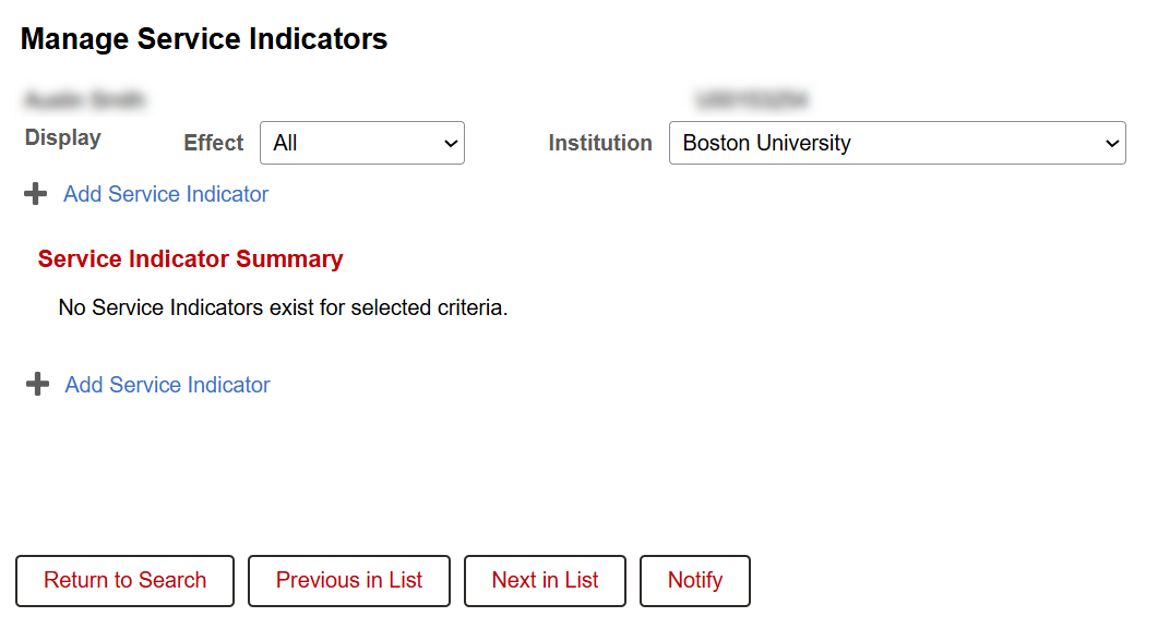 - On the Manage Service Indicators page, enter search criteria for the student whose Service Indicators need to be managed.