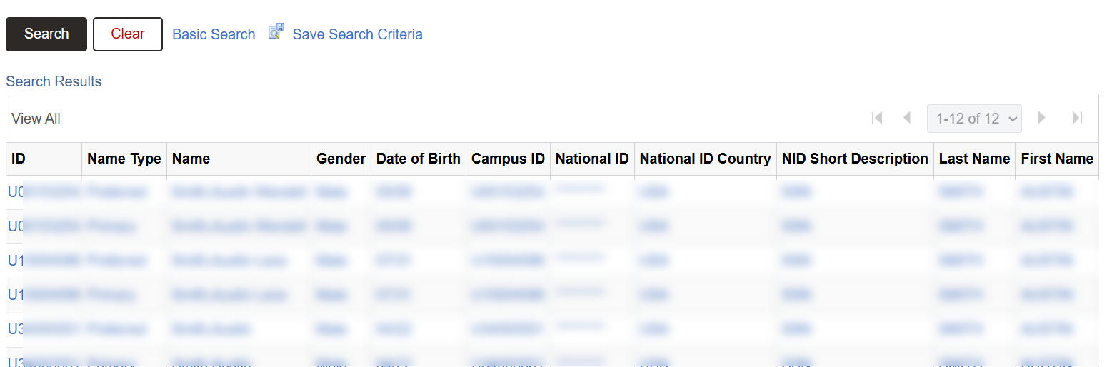 - If the student’s UID is NOT known, enter other search criteria as needed and click Search. (Note: Campus ID is the same as UID. National ID is social security number.)