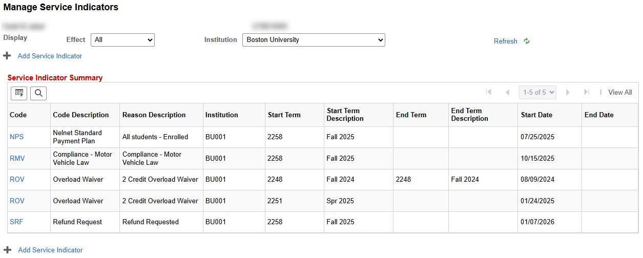 This section is NOT an exhaustive list of all service indicators. New service indicators may be configured in MyBU Student as additional needs arise, and the ability to view and/or manage certain service indicators may be restricted by security access.