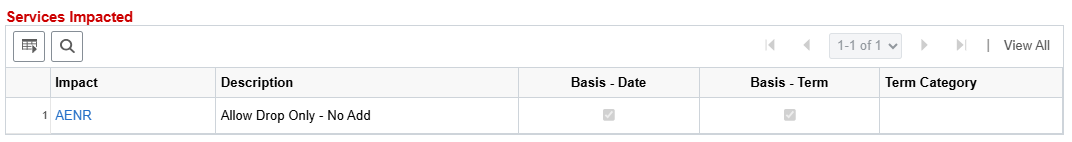 If no End Term value is entered, term-based impacts will be in effect until the service indicator is released. Similarly, if no End Date value is entered, date-based impacts will be in effect until the service indicator is released. For term-based impacts that will be in effect for all terms, a Start Term value of 0000 can be entered.