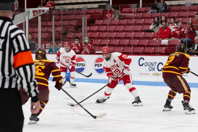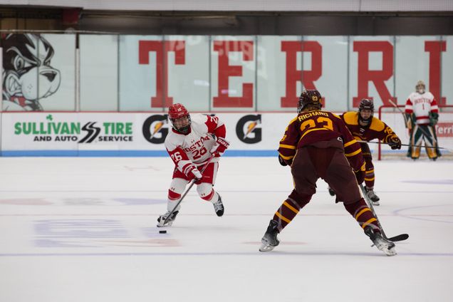 The Boston University women’s ice hockey team narrowly beat the Concordia University Stingers in an exhibition matchup through a shootout victory. The Stingers put themselves on the scoreboard early, with a power play goal in the sixth minute. However, senior forward Luisa Welcke responded for the Terriers in the 10th minute. In the second period, sophomore forward Lola Reid scored a power play goal 11 minutes in and freshman in the 13th minute, forward Lexie Bertelsen added another tally to give the Terriers a 3-1 lead. Concordia answer with their second goal seconds later and tied the game in the last minute of the period. Both teams scored in the third period, with senior forward Clara Yuhn finding the net for BU in the 10th minute of the period. Luisa Welcke and Bertelsen both converted their shootout attempts, while freshman goaltender Jackie Wright saved both attempts she faced to give Terriers the win.