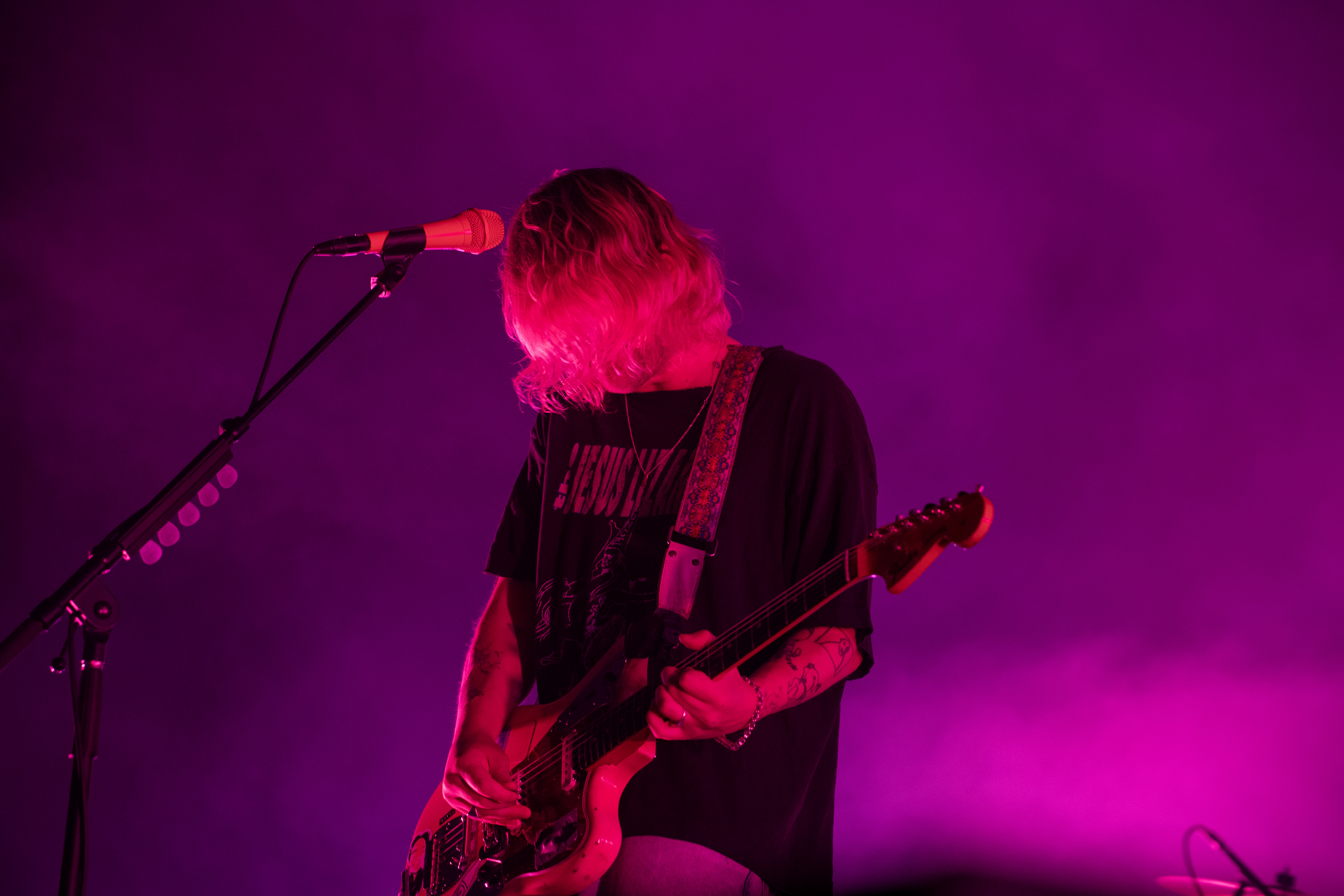 As one of my favorite bands of today, I went in with high expectations, which, off the bat, were not fully met with the opener. Bby, a five-piece band from London, seemingly lacked coherence as a group. The crowd was not quite into it, but I appreciated their enthusiastic presence on and off stage, as the lead singer, Benjy Gibson, often jumped off the stage to interact with the crowd.