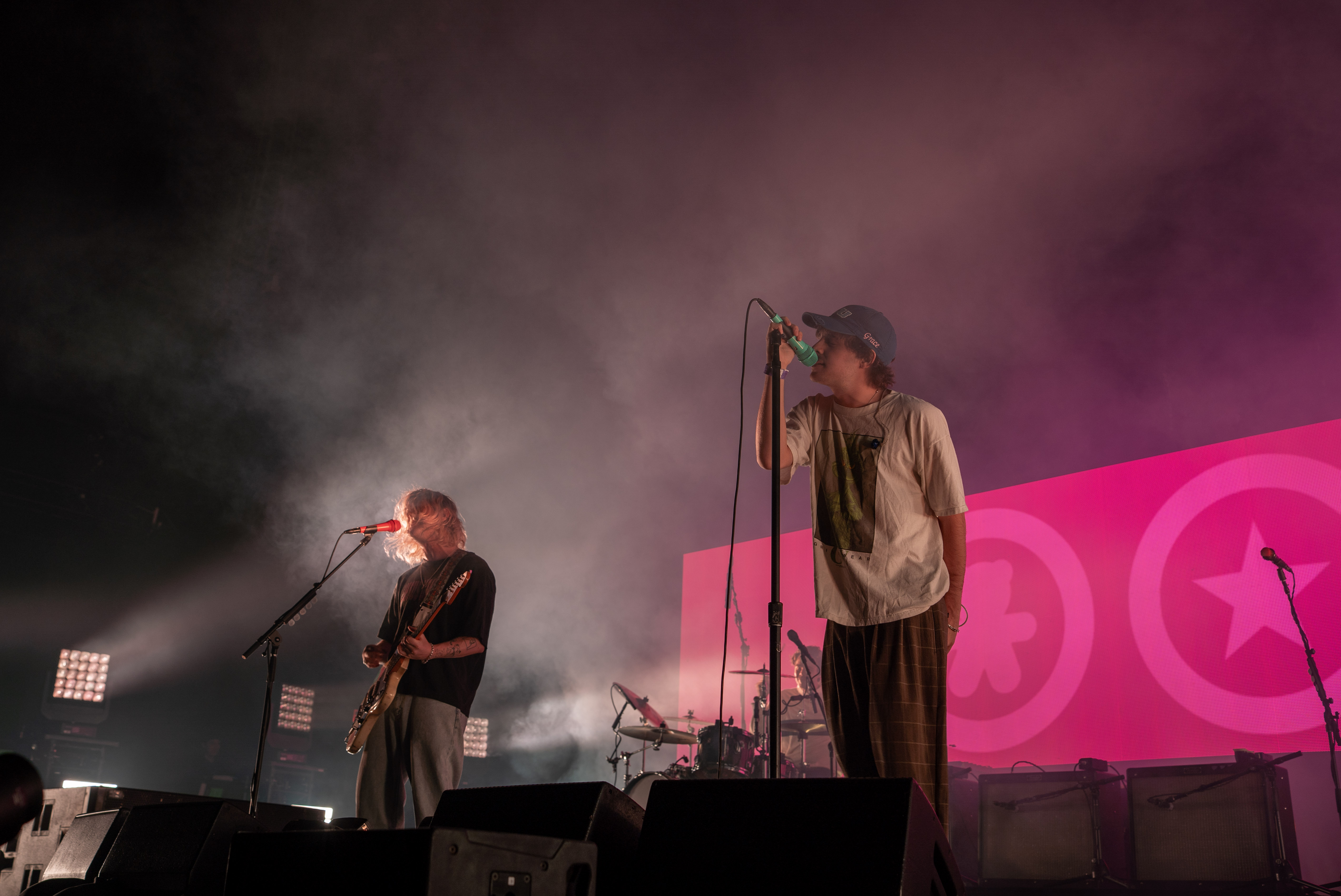 Once Royel Otis took the stage, the venue lit up pink and grey, the trademark colors from their sophomore album, “Hickey.” The duo opened the show with “i hate this tune,” the album’s opening track. The guitarist, Royel Maddell, brought the energy with a jump onto the stage and a captivating riff.