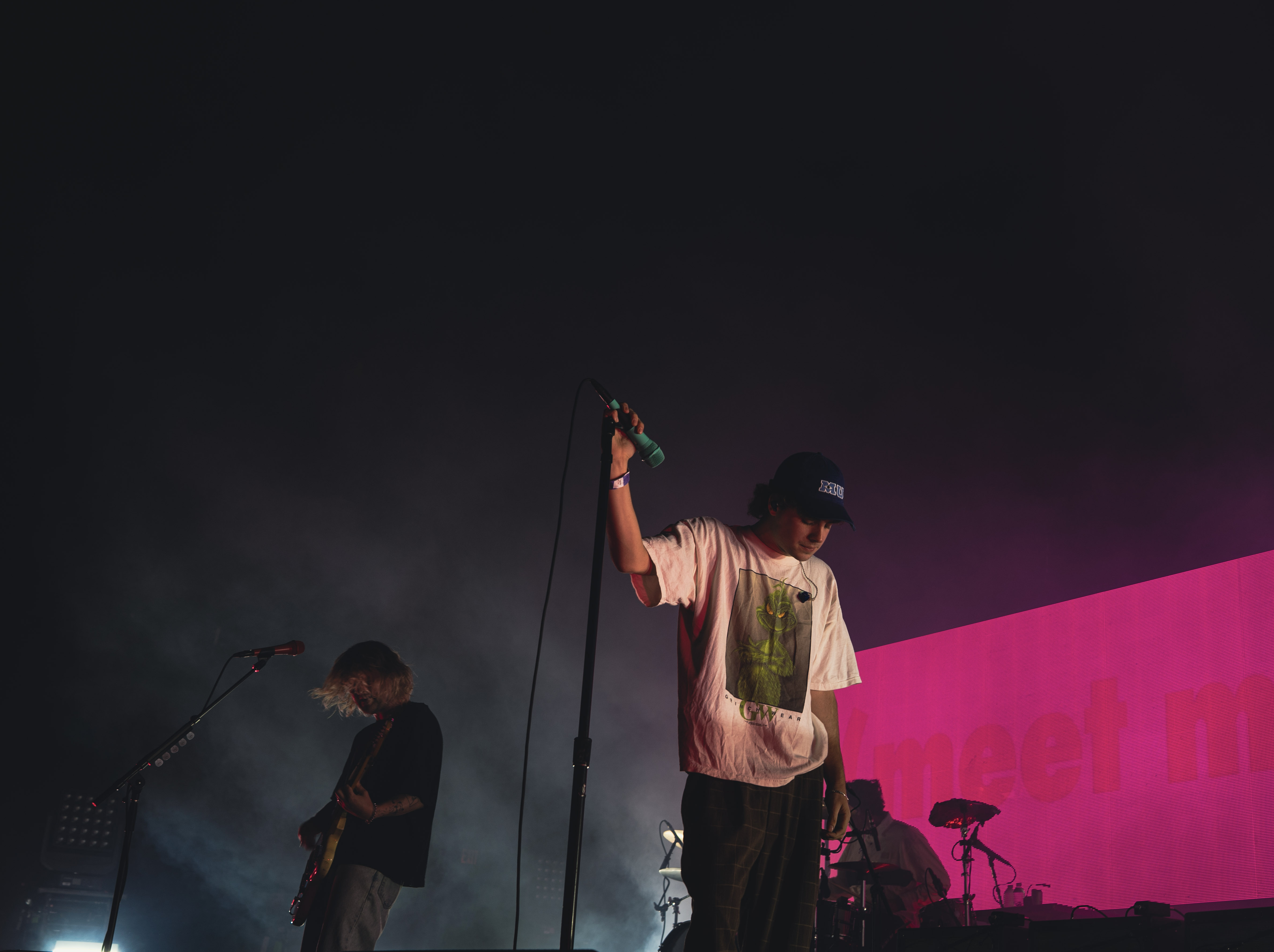 The band then went on to play two tracks from their debut album, “Adored” and “Heading for the Door,” which were accompanied by graphics from their respective music videos on screen. The duo isn’t exactly known for their dynamic stage presence, often maintaining a calm, humble demeanor that lets the crowd do the work. For some bands, this could come off as stuck-up or shy, but their chillness perfectly encapsulates the vibe of their music. Maddell rarely showed his face on stage and kept his face covered by his hair, matching the music well.