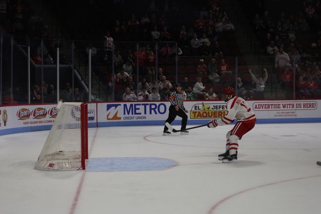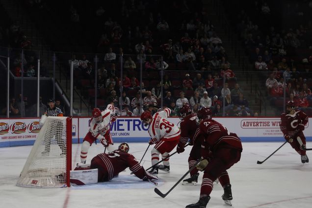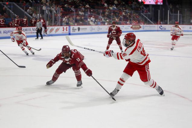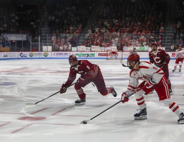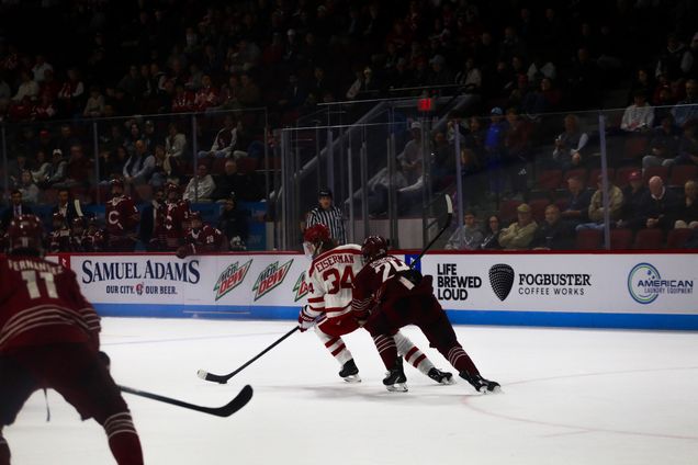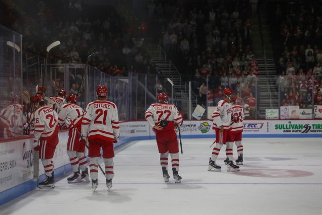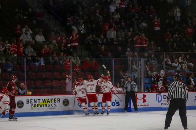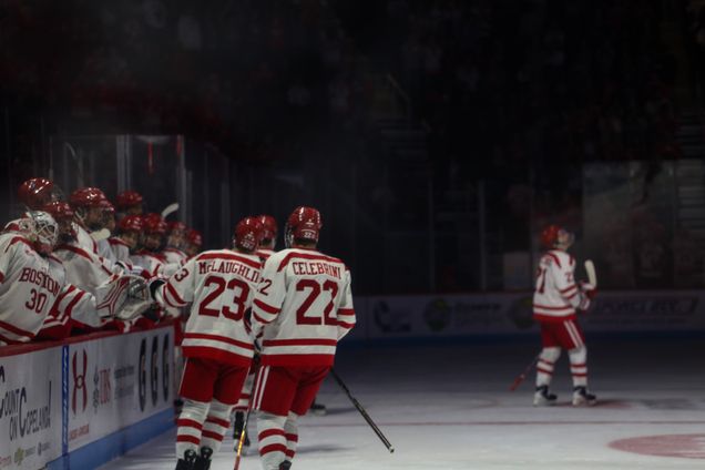 Boston University and Colgate players line up for the opening faceoff.Sophomore defenseman Cole Hutson (44) cuts around a Colgate player.Sophomore defenseman Cole Hutson (44) celebrates with teammates and the crowd after scoring.
