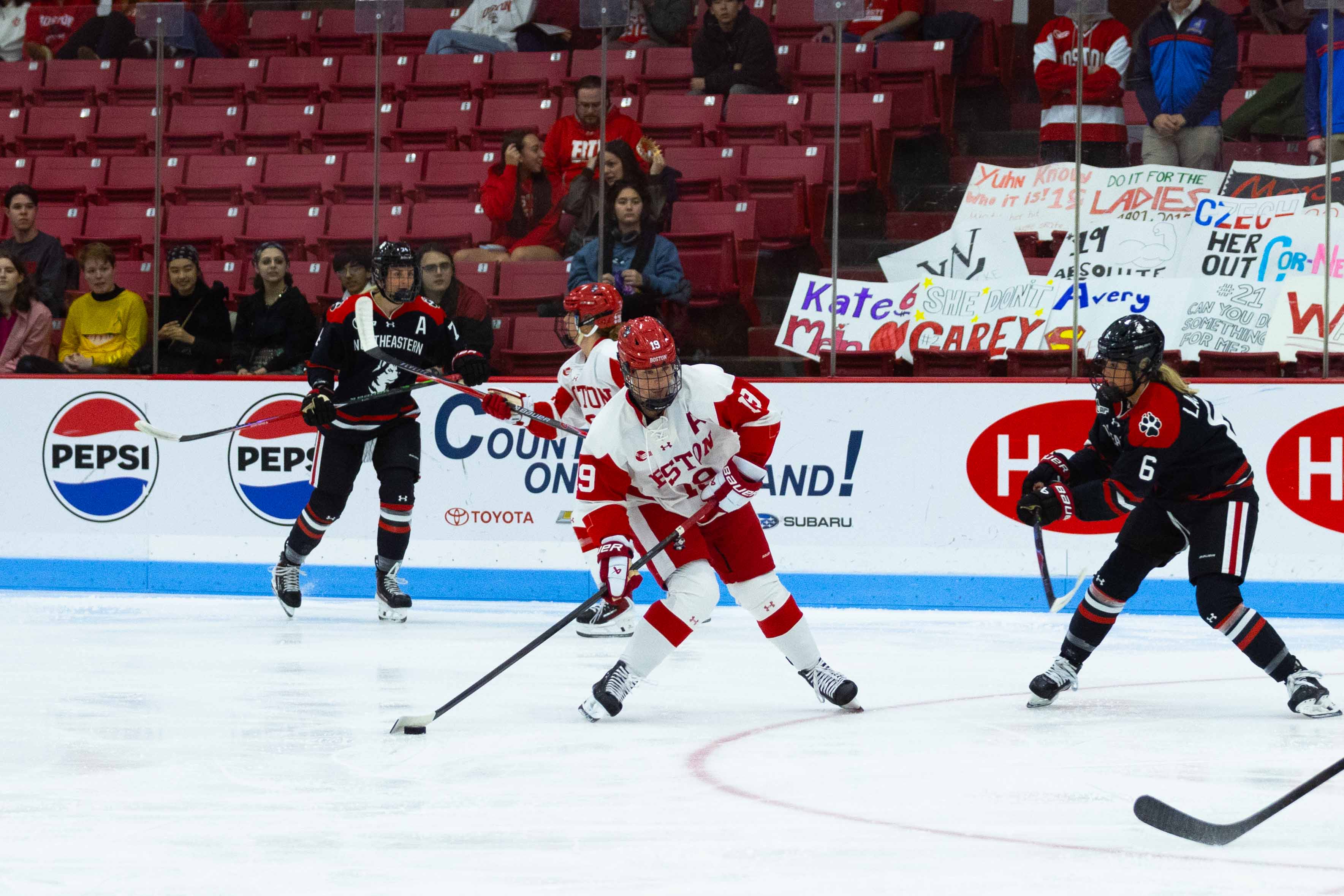 BU’s struggles continued as the Huskies scored again just under halfway through play with a tip-in goal in front from senior forward Lily Shannon. Northeastern piled up the score with another goal less than a minute later as a shot deflected off Carey’s stick into her own net.
