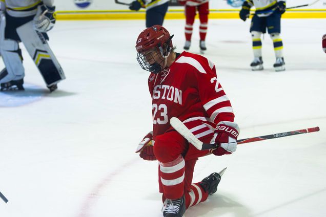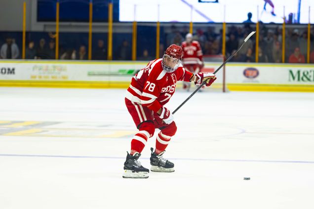 Sophomore forward Sacha Boisvert (9) controls the puck in the right circle.Senior forward Owen McLaughlin (23) prepares to take a faceoff.The Terriers celebrate junior defenseman Gavin McCarthy’s (2) goal.Sophomore defenseman Cole Hutson (44) pivots on the blue line with the puck.Freshman forward Conrad Fondrk (16) skates into the offensive zone.Senior forward Owen McLaughlin (23) controls the puck along the blue line.Sophomore forward Sacha Boisvert (9) shoots the puck.The Merrimack goaltender attempts to save sophomore defenseman Cole Hutson’s (44) one-timer.Sophomore defenseman Sascha Boumedienne (78) takes a slapshot from the point.Sophomore forward Brandon Svoboda (8) dekes the puck in the neutral zone.Freshman forward Jonathan Morello (10) skates backwards on the penalty kill.Senior forward Owen McLaughlin (23) embraces freshman forward Ryder Ritchie (21) after his goal.Junior defensemen Aiden Celebrini (22) stops right before the boards.Senior forward Owen McLaughlin (23) celebrates his goal.Senior forward Owen McLaughlin (23), sophomore forward Sacha Boisvert (9) and freshman forward Ryder Ritchie (21) huddle up before a faceoff.Junior forward Jack Harvey (12) shoots on an empty net.