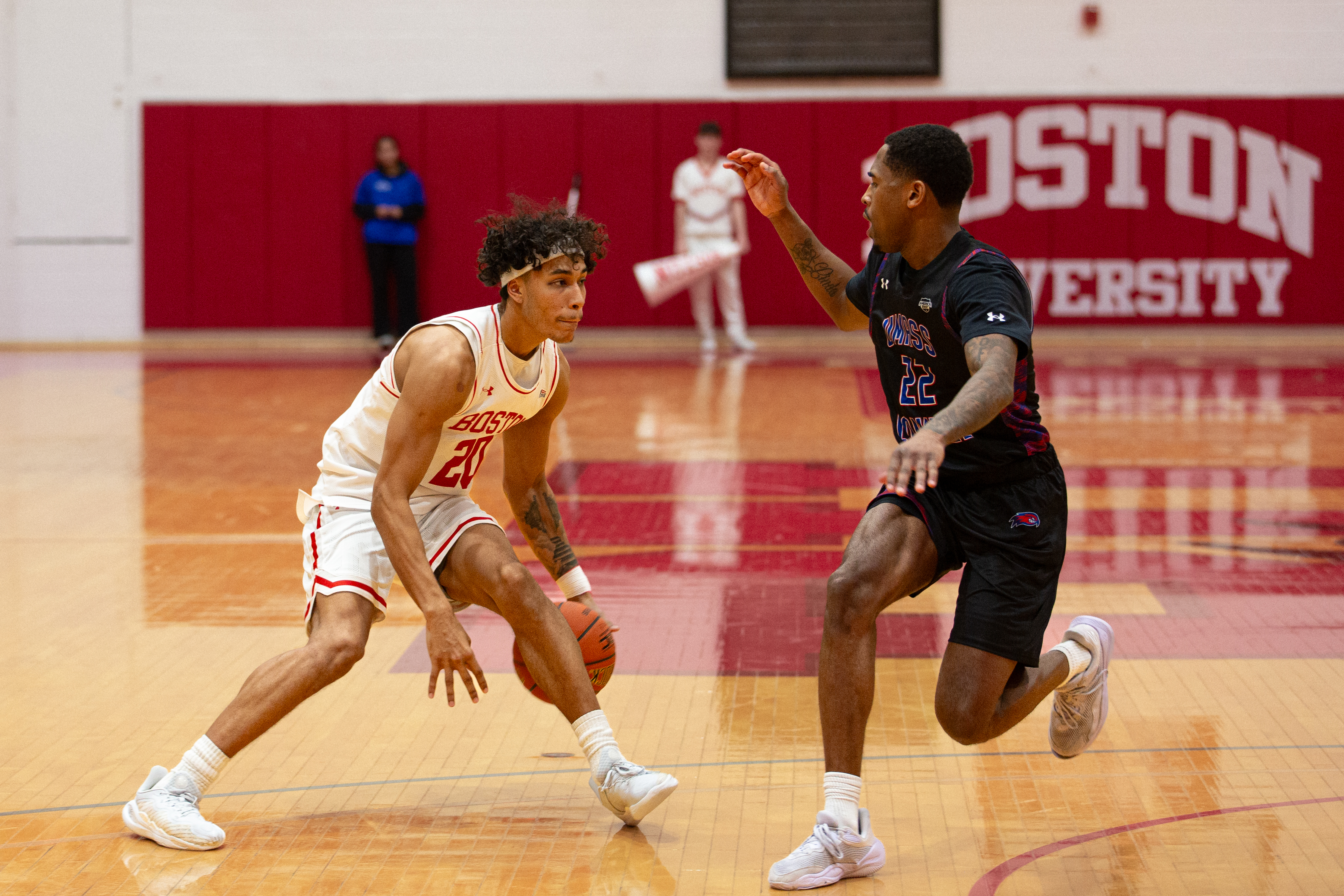 Junior guard Michael McNair (20) attempts a three-pointer.Freshman guard Chance Gladden (2) at the freethrow line.The Terriers huddle up before tip-off.Sophomore forward Ben Defty (14) wins the jump ball for the Terriers.Graduate guard Ethan Okwuosa (1) during warmups.The Terriers celebrate on the bench.Freshman guard Chance Gladden (2) dribbles through defenders.Sophomore guard Azmar Abdullah (7) looks for a pass from teammate at the corner.Junior guard Matai Baptiste (0) and teammates celebrates at the bench.Freshman guard Donte Tisinger Jr. (21) and teammates celebrate during the post-game interview.Graduate forward Malcolm Chimezie (3) lays up.Junior guard Michael McNair (20) dribbles into the offensive zone.Sophomore forward Ben Defty (14) tries to go through Lowell players with the possession of the ball.The Terriers and coaches wave to the crowd after the game.